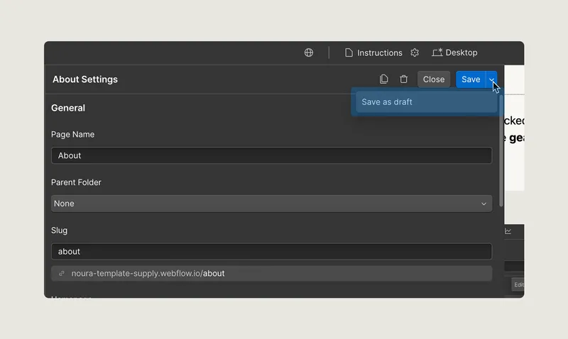 If there are pages in the template that you don’t plan to use right now, you can set them as drafts. Draft pages won’t be published to your live site, but you can still access and edit them inside the Webflow Designer. This is useful for keeping things organized while you build your site. You can set a page as draft on its page settings by clicking the arrow next to the save button.